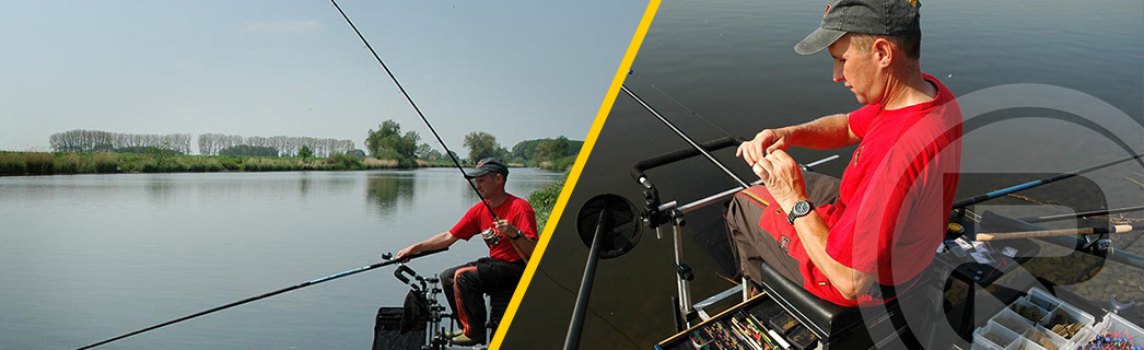 “Wat een prachtig water, in Engeland vissen we zelden op zulk mooi natuurwater. Onze kanaal(tjes) zijn erg smal en ondiep en moeten een hoge hengeldruk doorstaan. Vaak moeten we de vis met de vaste hengel uit de overzijde peuteren. We hebben geen hengelbeperking, 16 meter ver vissen met de vaste hengel is vrij normaal. Op de wedstrijdvijvers zwemt veelal karper, in alle maten en soorten, daar moet de trukendoos echt helemaal open.” Mark besluit het voer netjes onder de top op 13 meter te plaatsen. Indien nodig kan hij er nog gemakkelijk een hengeldeel bijsteken om achter de voerplek te vissen. Hij legt de hengel met een voercup in de steunen. Het zwarte cupje is zijn target en duidt zijn visplek perfect aan. De mix wordt nog even afgemaakt met een ‘handje’ water.