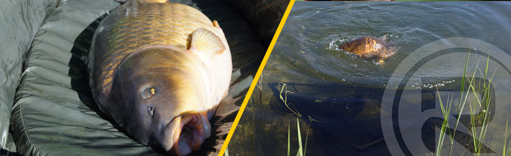 Na het wegen en fotograferen zetten we de karper natuurlijk weer netjes terug in zijn element. Dit kan gemakkelijk door de onthaakmat of weegzak en de vis op het water te leggen. Door de kant waar de bek van de karper ligt onder water te laten lopen komt hij steeds verder in het water te liggen. Pak hierna de vis bij de staartwortel vast en laat hem even op krachten komen. Je merkt vaak snel genoeg wanneer hij met een paar krachtige slagen terug de diepte in wil zwemmen.