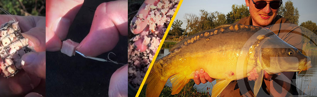 Om meat als grondvoer te gebruiken heb je een paar dingen nodig: meat natuurlijk, een emmer en een stevige zeef met een groffe maas. Snij de meat in repen en druk de meat door de zeef boven je emmer. Je krijgt nu een korrelig voer wat je gelijk kunt gebruiken. Je voer kun je zelf nog veel mooier maken door er verschillende attractors aan toe te voegen. Denk bijvoorbeeld aan hennep, mais, maden, liquid, enzovoort. Zelf ben ik een groot fan van de meat/hennep combinatie. Meat blijft perfect in je korf zitten en als je het goed hebt gedaan, komt het er zo uit te zien als op onderstaande afbeelding.