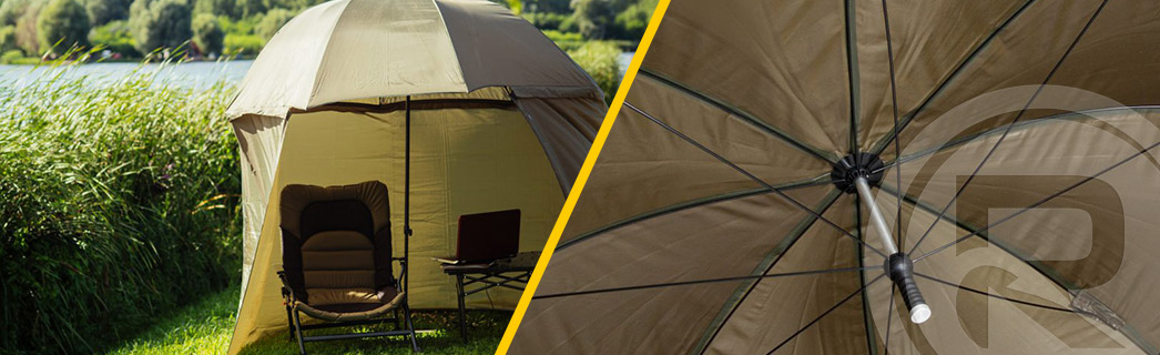 brolly's zijn paraplu’s met 'zijflappen' en kunnen worden gebruikt als windscherm of overnighter. Je kunt ze op verschillende manieren opzetten, zodat je geen last hebt van de centrale pin tijdens het vissen. De diameter van een paraplu wordt gemeten, van het ene punt tot het andere punt, over de paraplu. Sommige paraplu’s hebben swivelcaps. Een swivelcap is een extra schroefdraadbevestiging voor een stormpaal of bankstick (hengelsteun). Je kunt dan de pin verwijderen, zodat je daar helemaal geen last meer van hebt. Je kunt je paraplu dan laten steunen op de stormpalen. Over veel paraplu's en brolly’s kun je een overwrap gebruiken. Een overwrap is een extra tentdoek, die precies over je paraplu/brolly heen past. Wanneer je een overwrap koopt, dan krijg je er vaak een grondzeil en haringen bij. Op die manier kun je eenvoudig van je paraplu/brolly een gesloten tent maken. Wel zo fijn als je niet gewekt wilt worden door de muggen of ochtendzon! De brolly's en paraplu's zijn sneller op te zetten dan tenten en shelters! Het enige nadeel is het centrale span-mechanisme, deze neemt 'veel' ruimte in.
